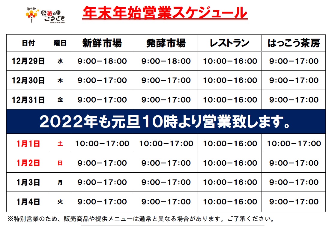NEWS2021年12月9日 年末年始営業時間のお知らせ 日頃より当駅のご利用、誠にありがとうございます。 年末年始の営業スケジュールをお知らせいたします。 下記の画像をクリックいただくと、拡大できます。 皆様のご来店、心よりお待ち申し上げております。