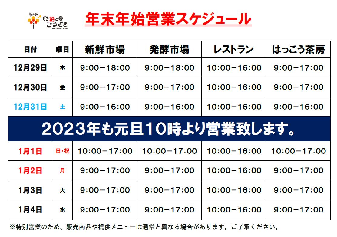 NEWS2022年11月30日 年末年始も休まず営業致します。 日頃より当駅をご利用いただき、 誠にありがとうございます。 本年も残りわずかとなりましたが、 年末年始の営業についてお知らせいたします。 ↓※下記画像をクリックするとご確認いただけます。